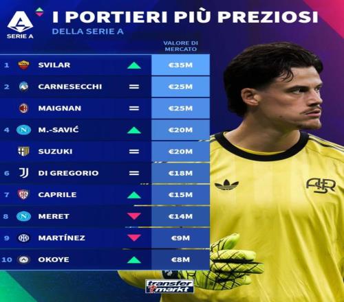 北京時(shí)間12月25日,在更新了意甲球員的身價(jià)之后,德轉(zhuǎn)列出了此次更新后意甲門將身價(jià)前10,羅馬的斯維拉爾以3500萬歐元高居第一,卡爾內(nèi)塞基和邁尼昂同以2500萬歐元并列第二。