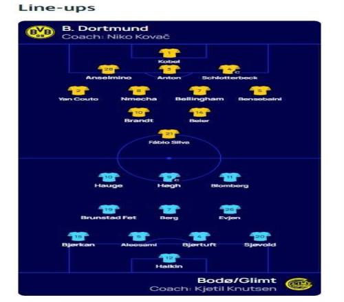 北京時間12月11日04:00,歐冠 聯(lián)賽階段 第6輪,多特蒙德主場迎戰(zhàn)博德閃耀,賽前雙方球隊首發(fā)名單公布如下: