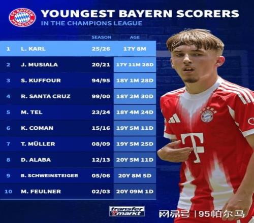 這不是卡爾第一次搶流量。10月歐冠拜仁對(duì)陣布魯日,他以17歲242天的年齡成為拜仁歐冠隊(duì)史最年輕進(jìn)球球員;11月德甲對(duì)陣弗賴堡,他以17歲273天的年齡,成為拜仁隊(duì)史德甲單場傳射建功最年輕的球。